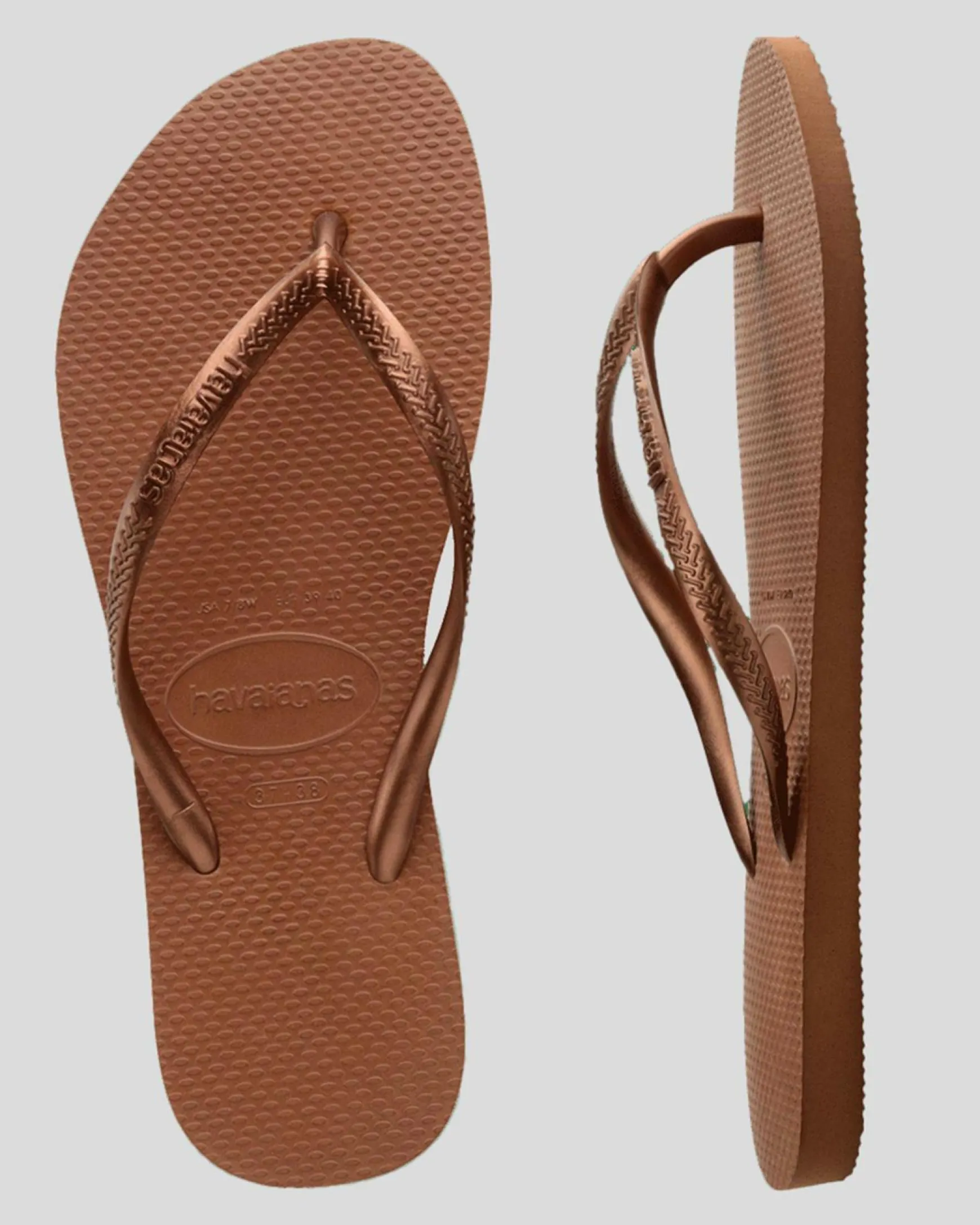 Step out in style with the Havaianas Slim Metallic Thong in Rust. The metallic copper color adds a touch of glamour to your beach look.