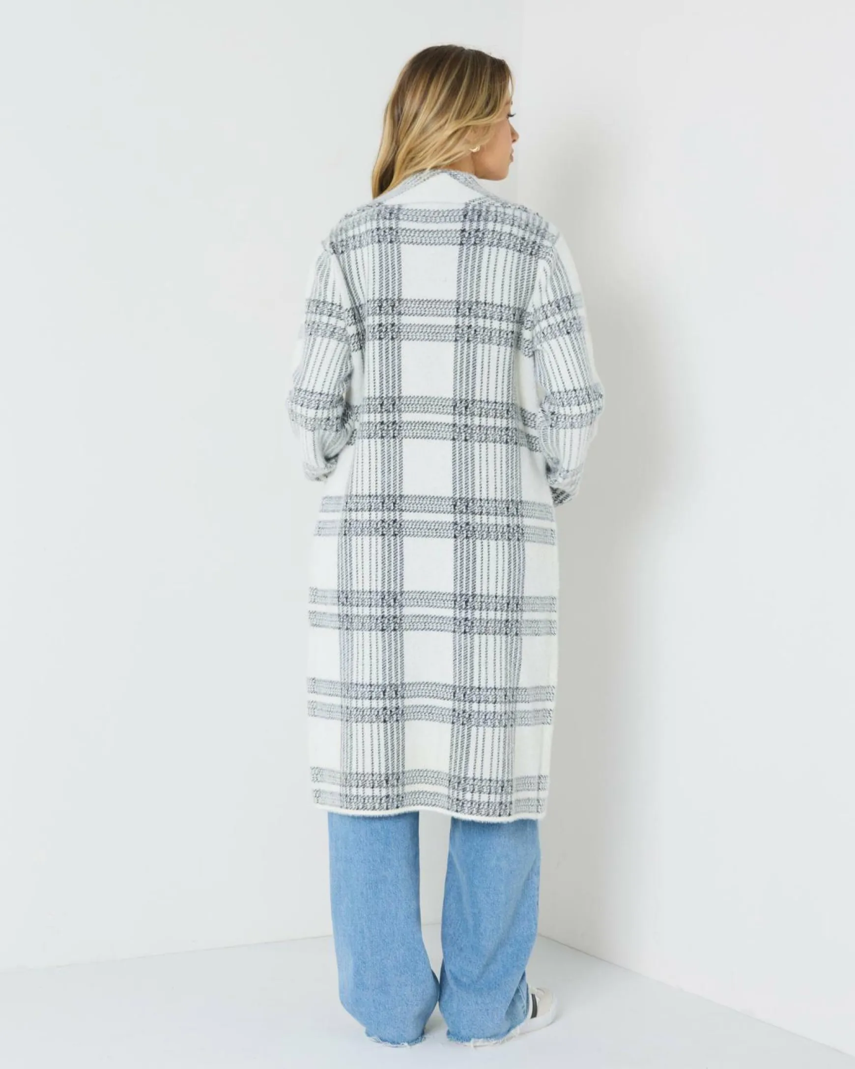 Stay cozy and stylish in the Ava And Ever Banks Knit Coatigan in Cream. This cream coatigan features a classic black check pattern, perfect for layering this season.