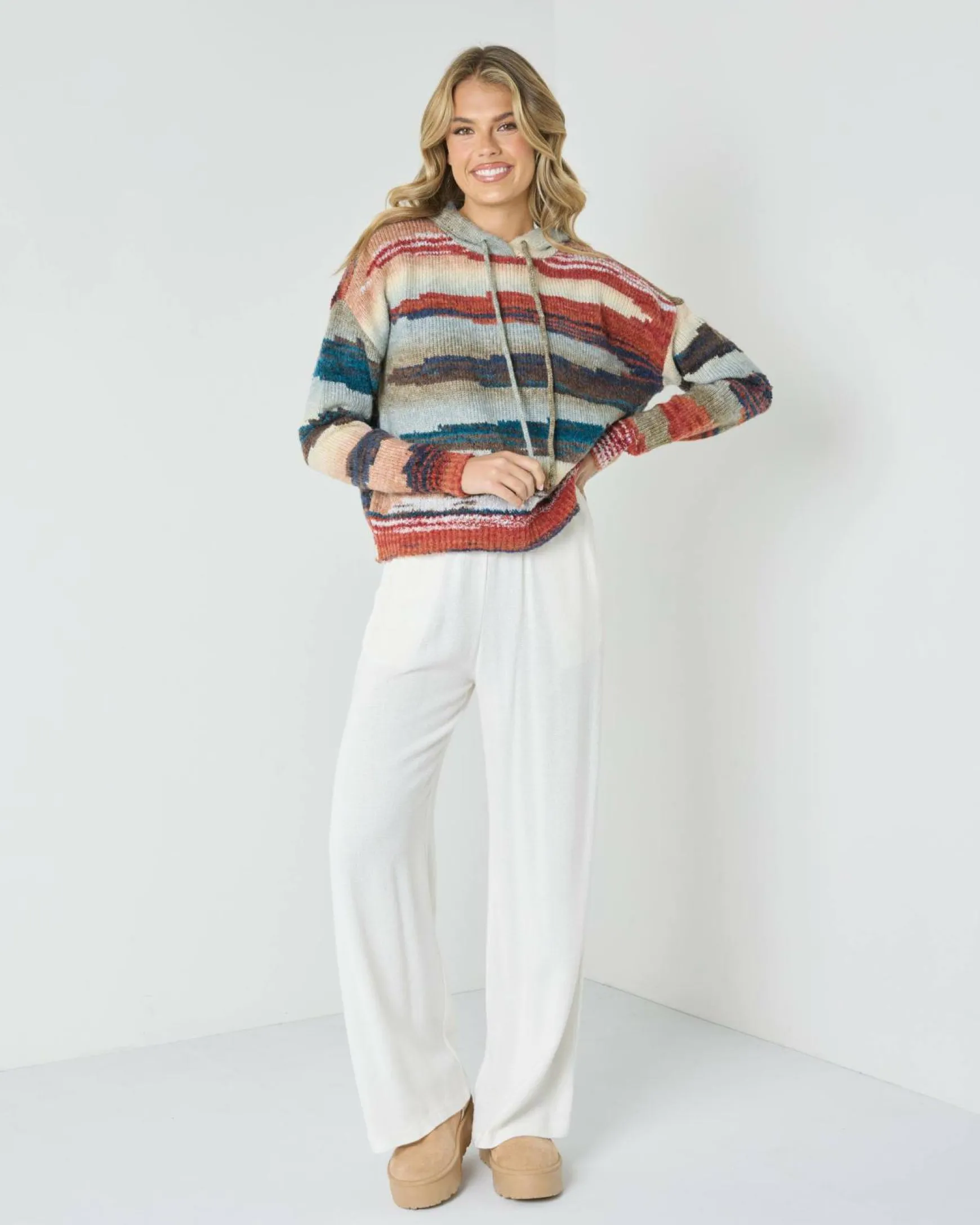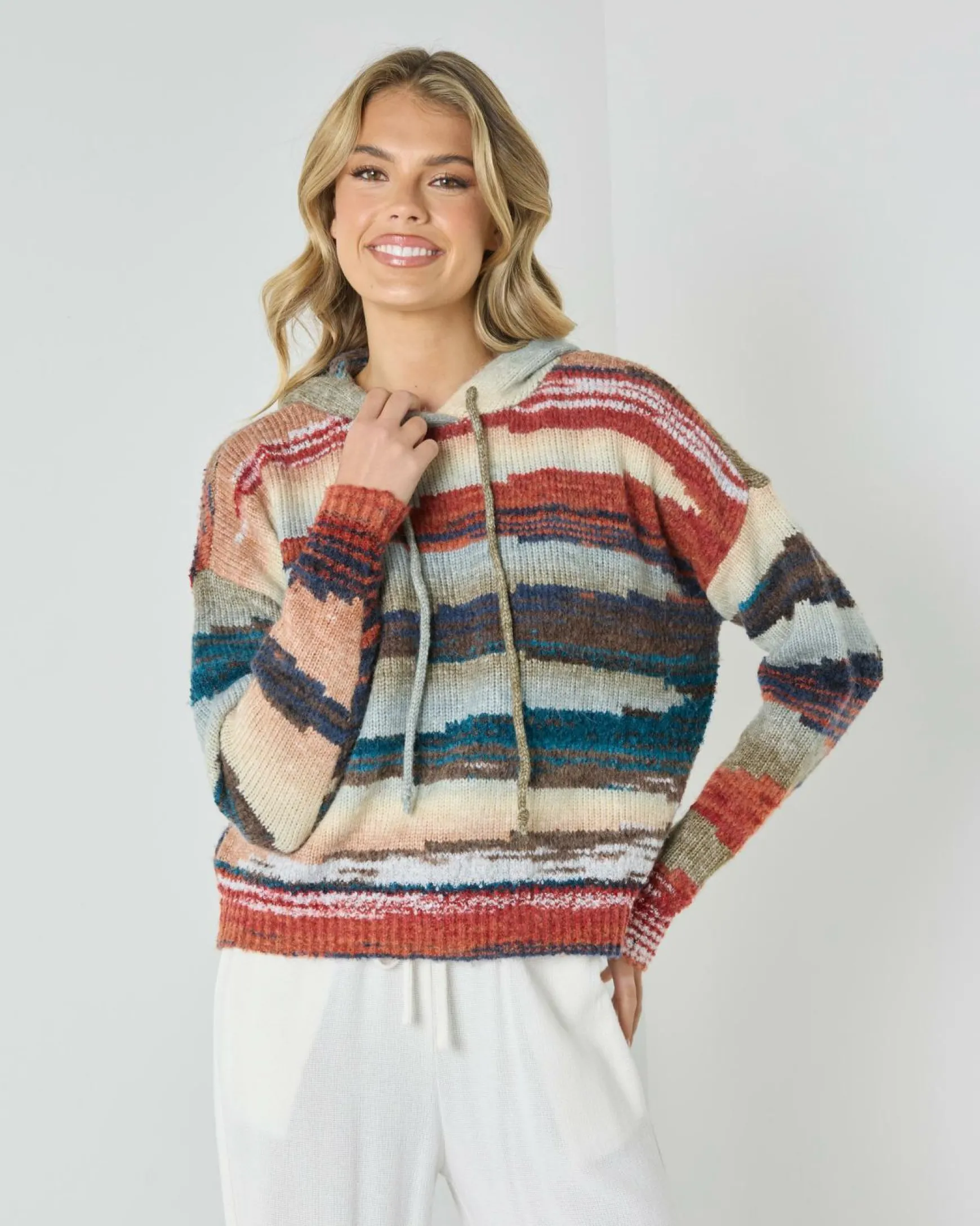 Stay cozy in the Mooloola Byron Hooded Knit Jumper in a vibrant multi-colour design. Perfect for adding a pop of colour to your winter wardrobe.