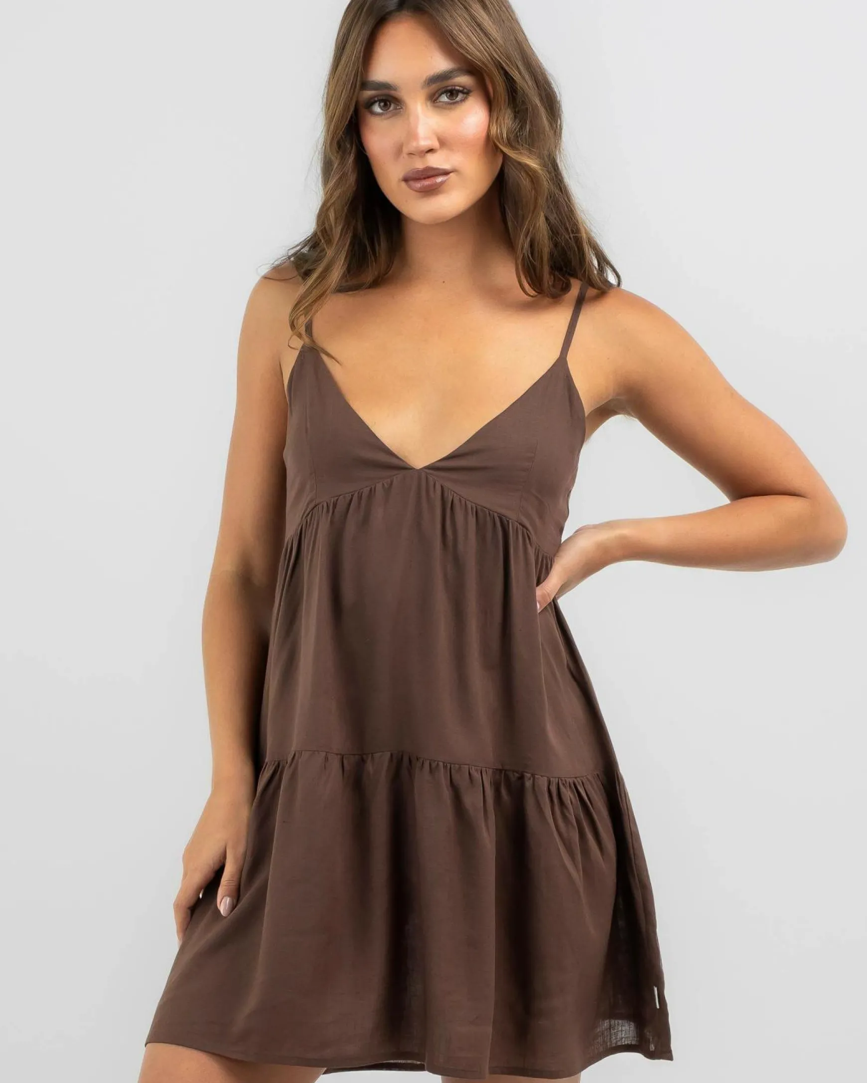 The Rhythm Classic Tiered Mini Dress in chocolate brown is a chic and stylish choice for any occasion.