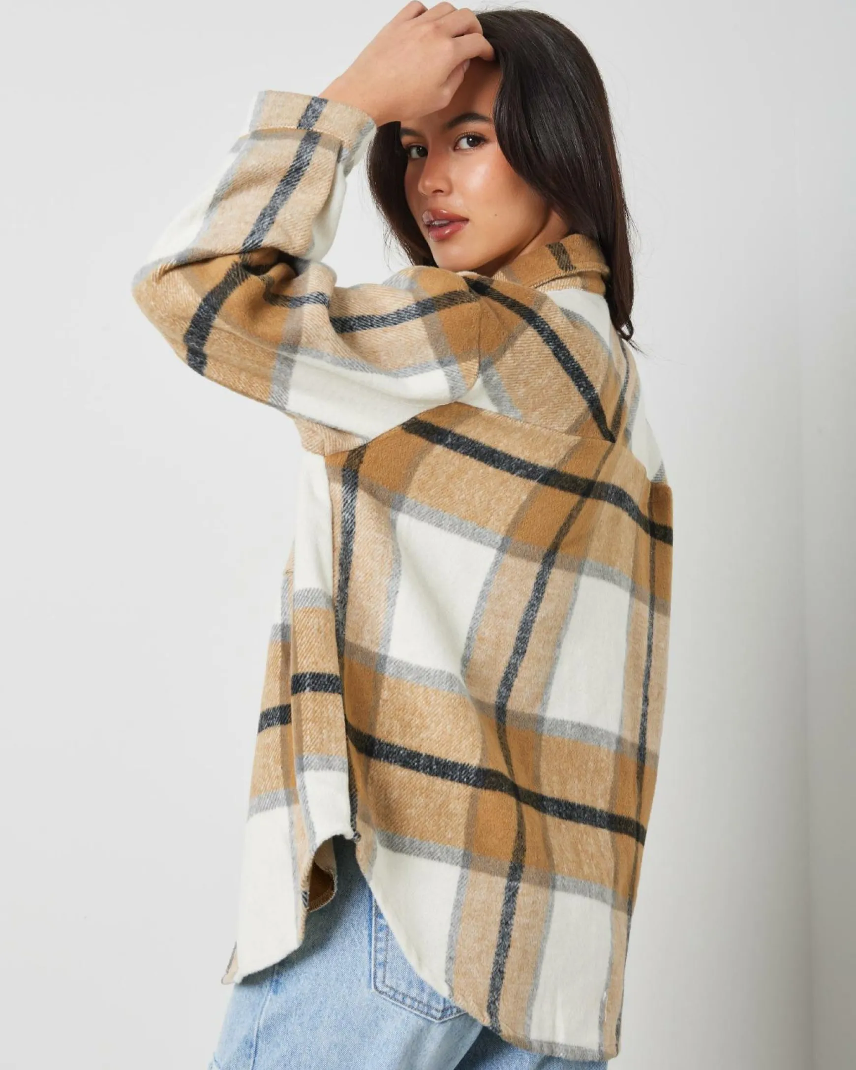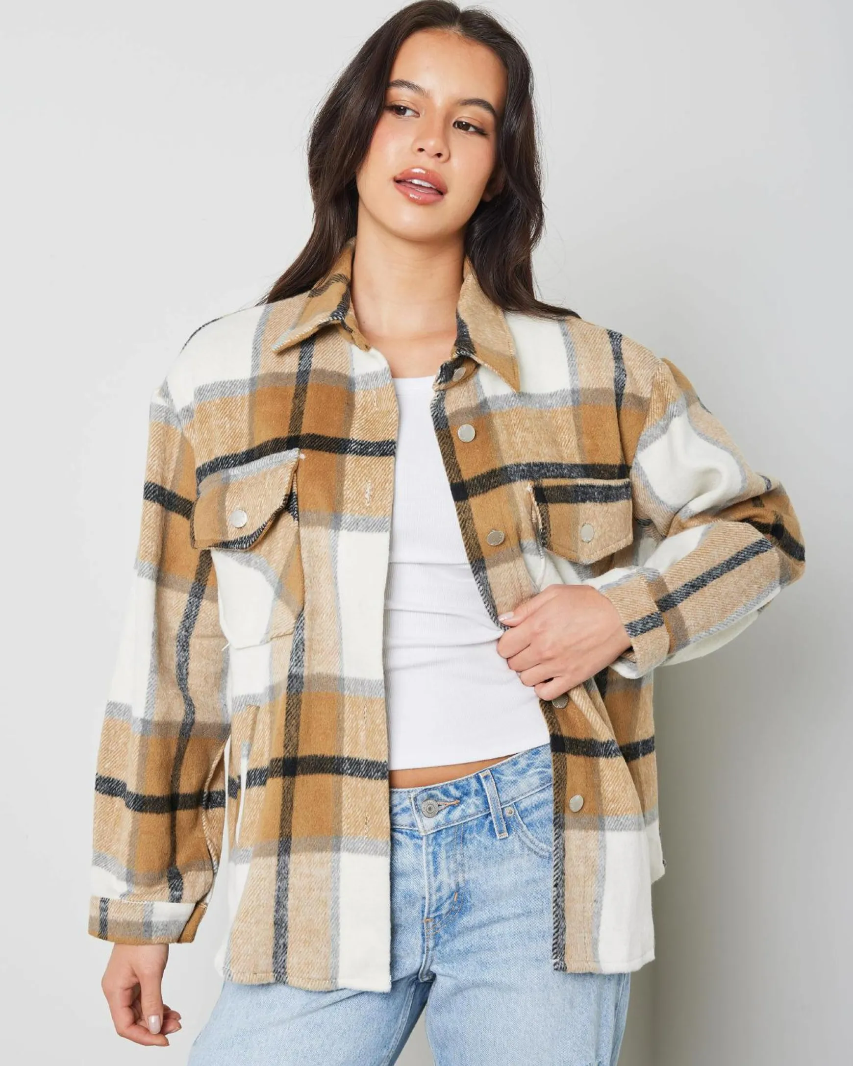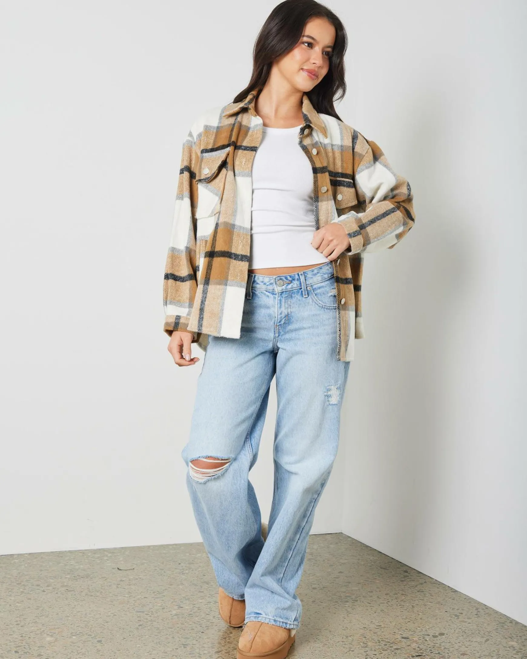 The Mooloola Dylan Shacket in Cream is a versatile wardrobe staple with a pop of green detail. Perfect for effortless style all year round.