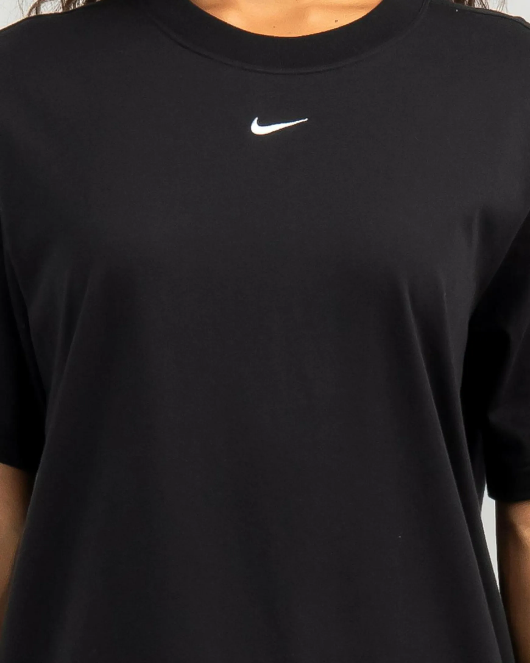 The Nike Essential T-Shirt in White is a classic wardrobe staple, featuring the iconic Swoosh logo and a contrasting black trim.