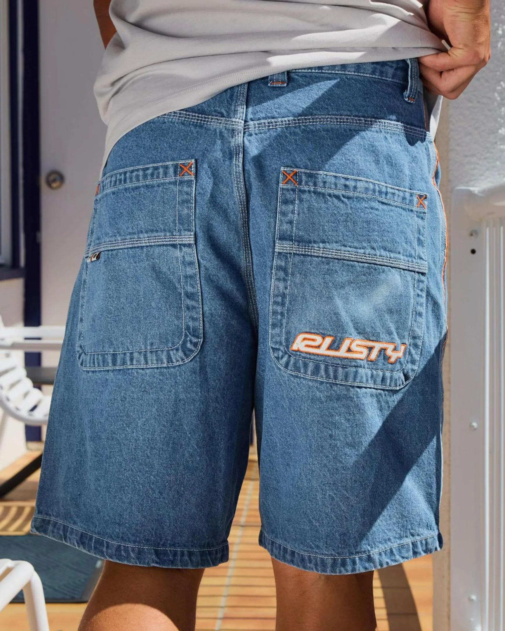 The Rusty Flip Daddy 2.0 Jean Shorts in Middy Blue are a stylish addition to your summer wardrobe, featuring a trendy and versatile denim colour.