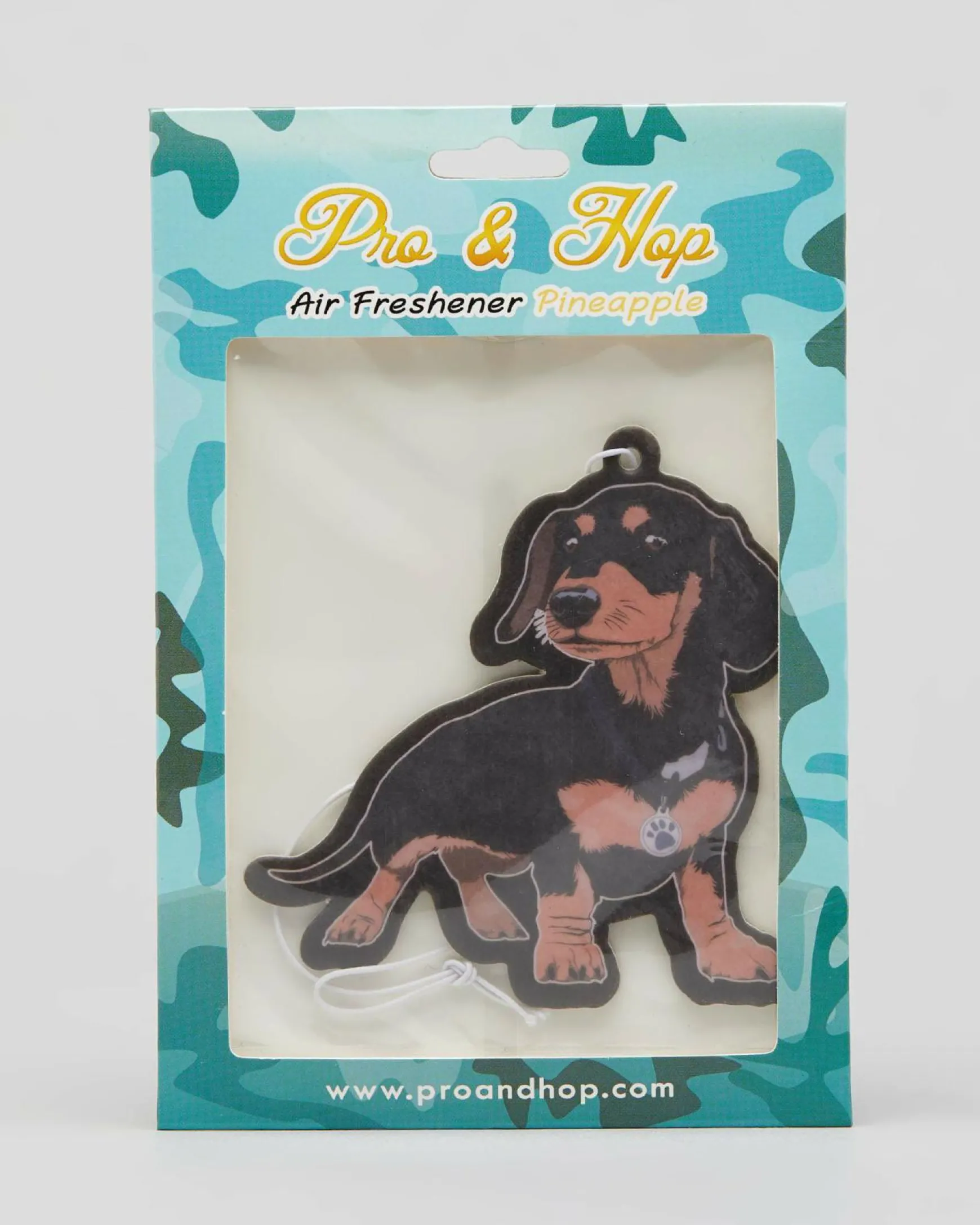 The Shop Pro & Hop Frankie Sausage Dog Air Freshener in Black/tan is a quirky and stylish accessory for your car, adding a fun touch to your daily commute.