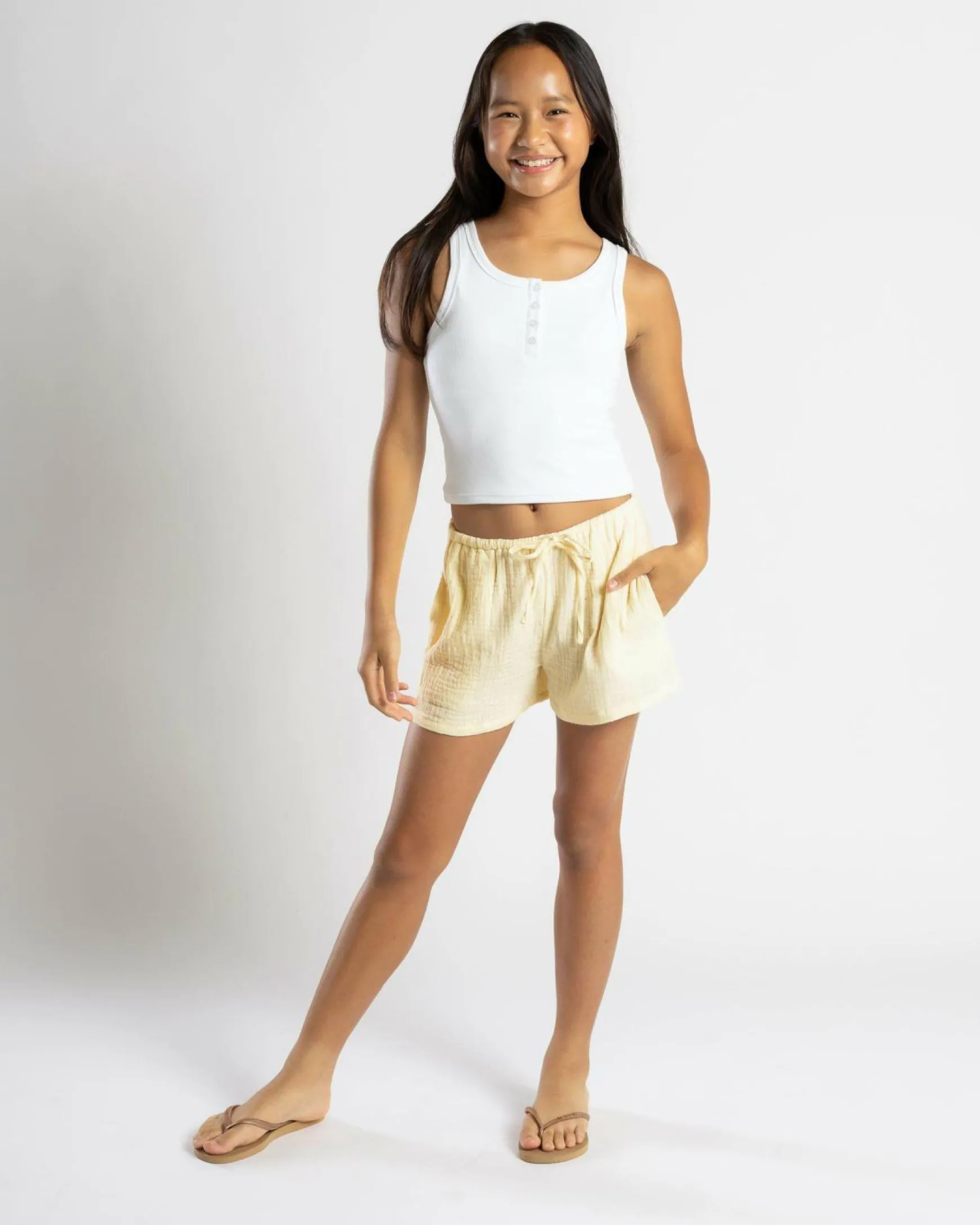 Shop the Mooloola Girls’ Lennox Shorts in crisp white. Perfect for sunny days and casual outings, these shorts are a must-have for any summer wardrobe.