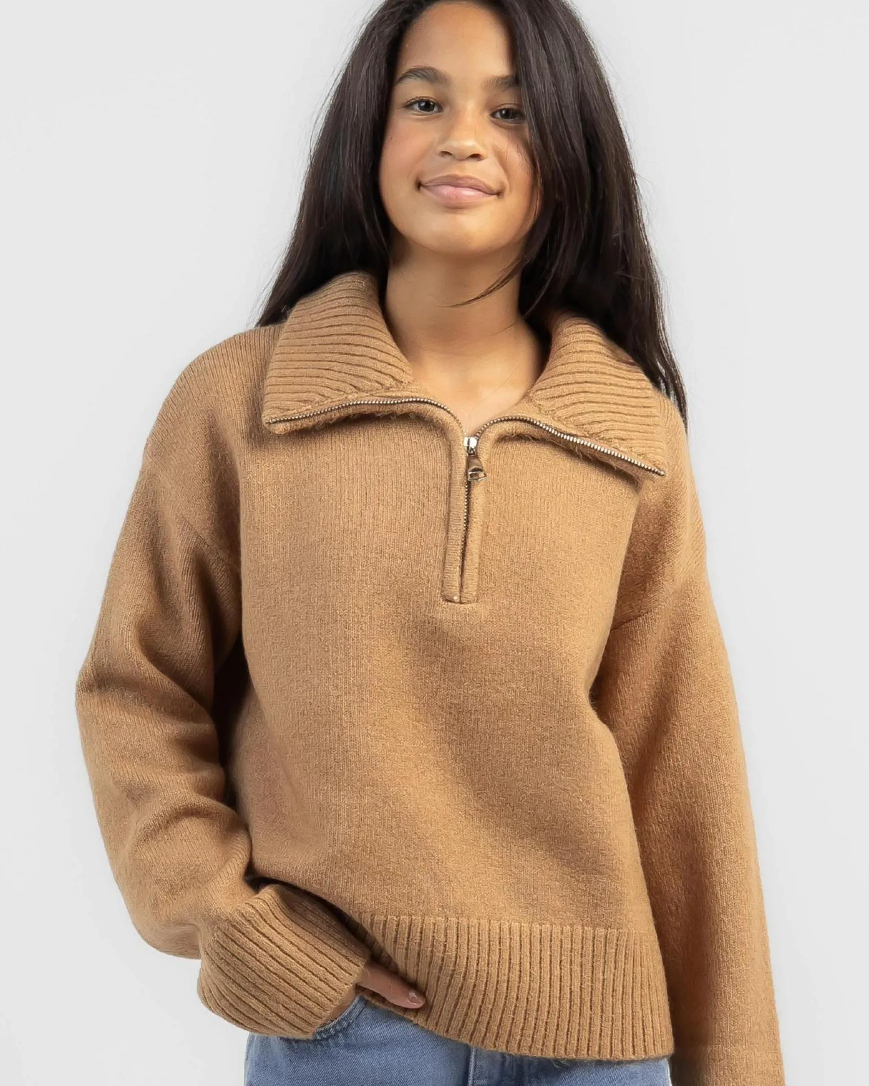 Stay stylish and cozy in the Ava And Ever Girls’ Stanford Collared Knit Jumper in Camel. Perfect for cool weather days.