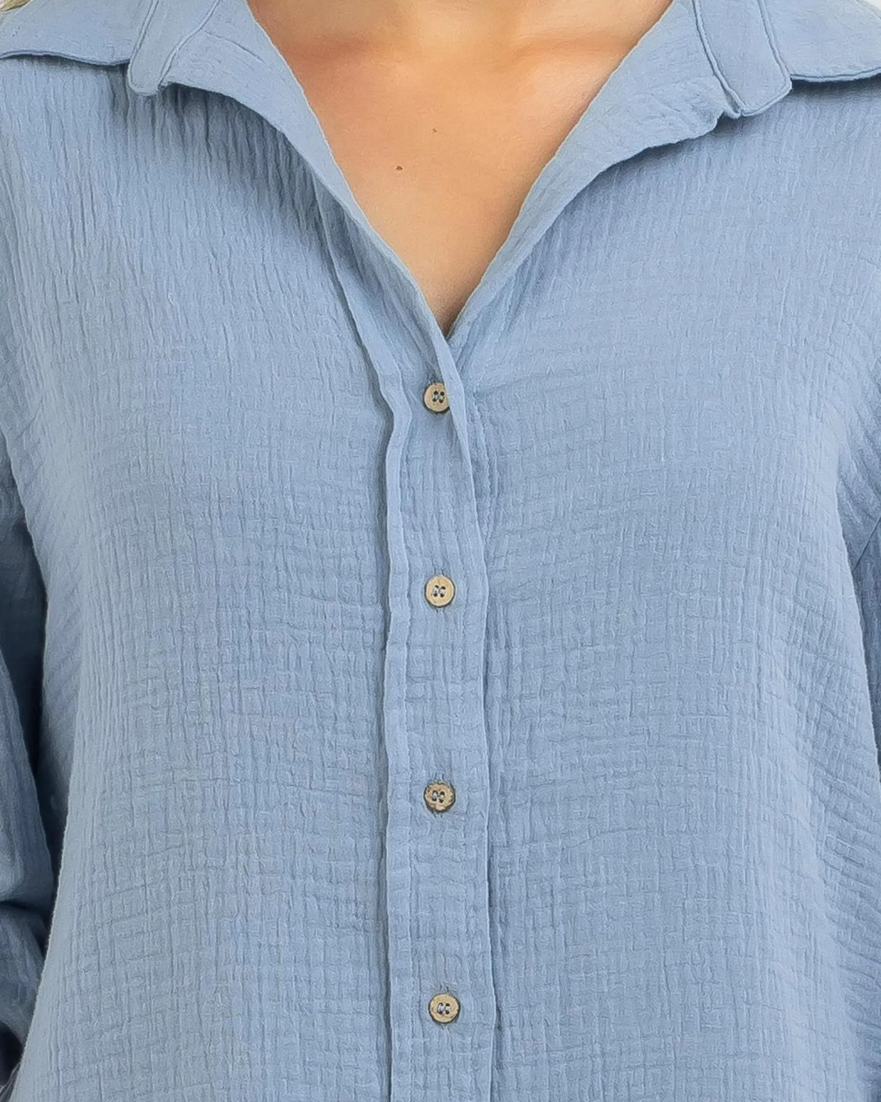 The Topanga James Beach Cover in serene baby blue is the perfect accessory for a chic beach look.
