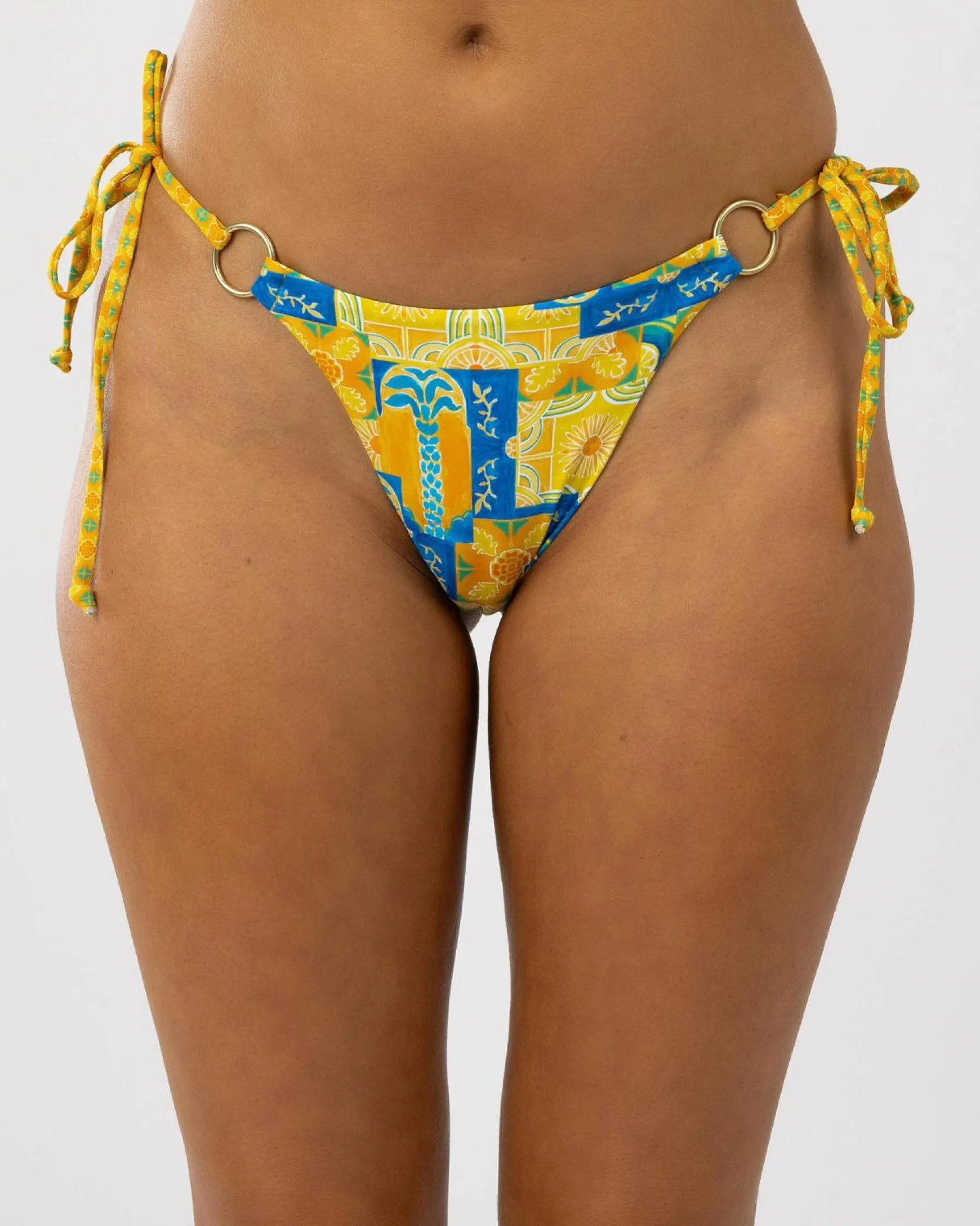 The Kaiami Nirvana Ring Itsy Bikini Bottom in Multi features a vibrant pattern that will make a statement at the beach or pool.
