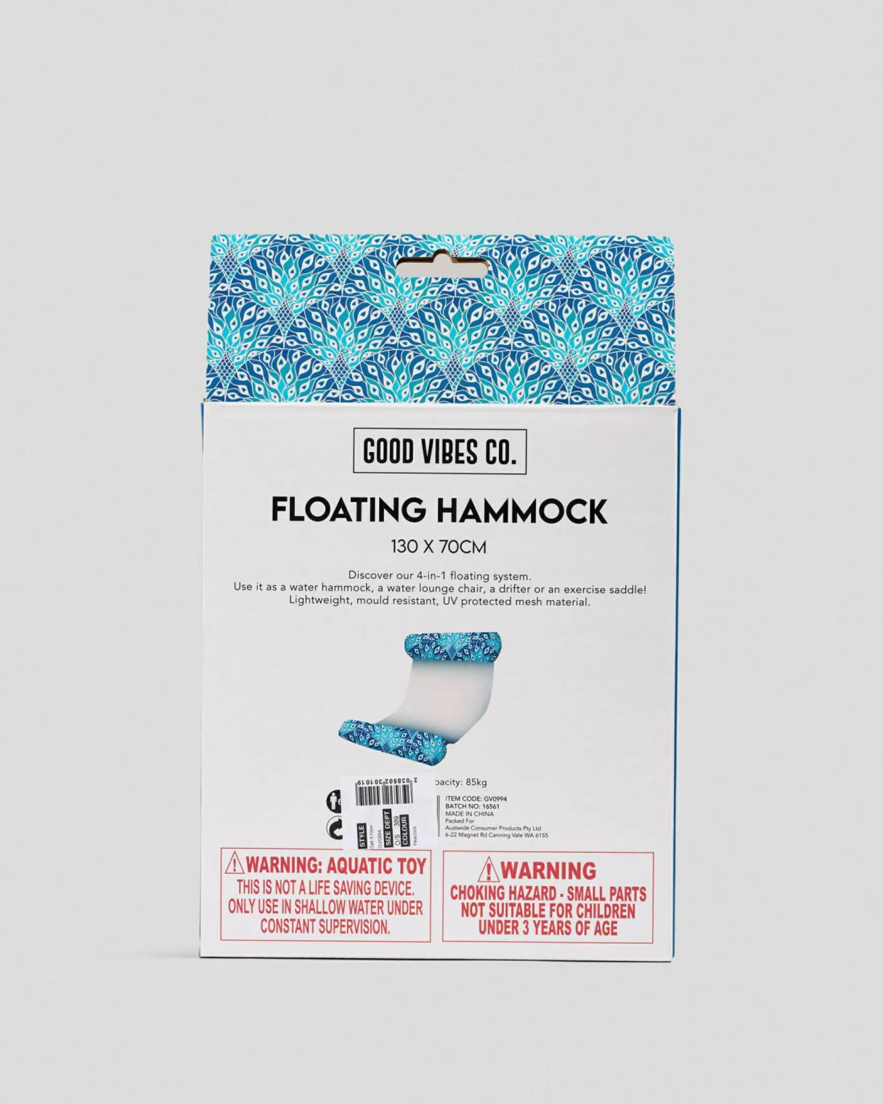 “Materials: polyester, PVC. Includes: 1 x floating hammock. 130 x 70cm “