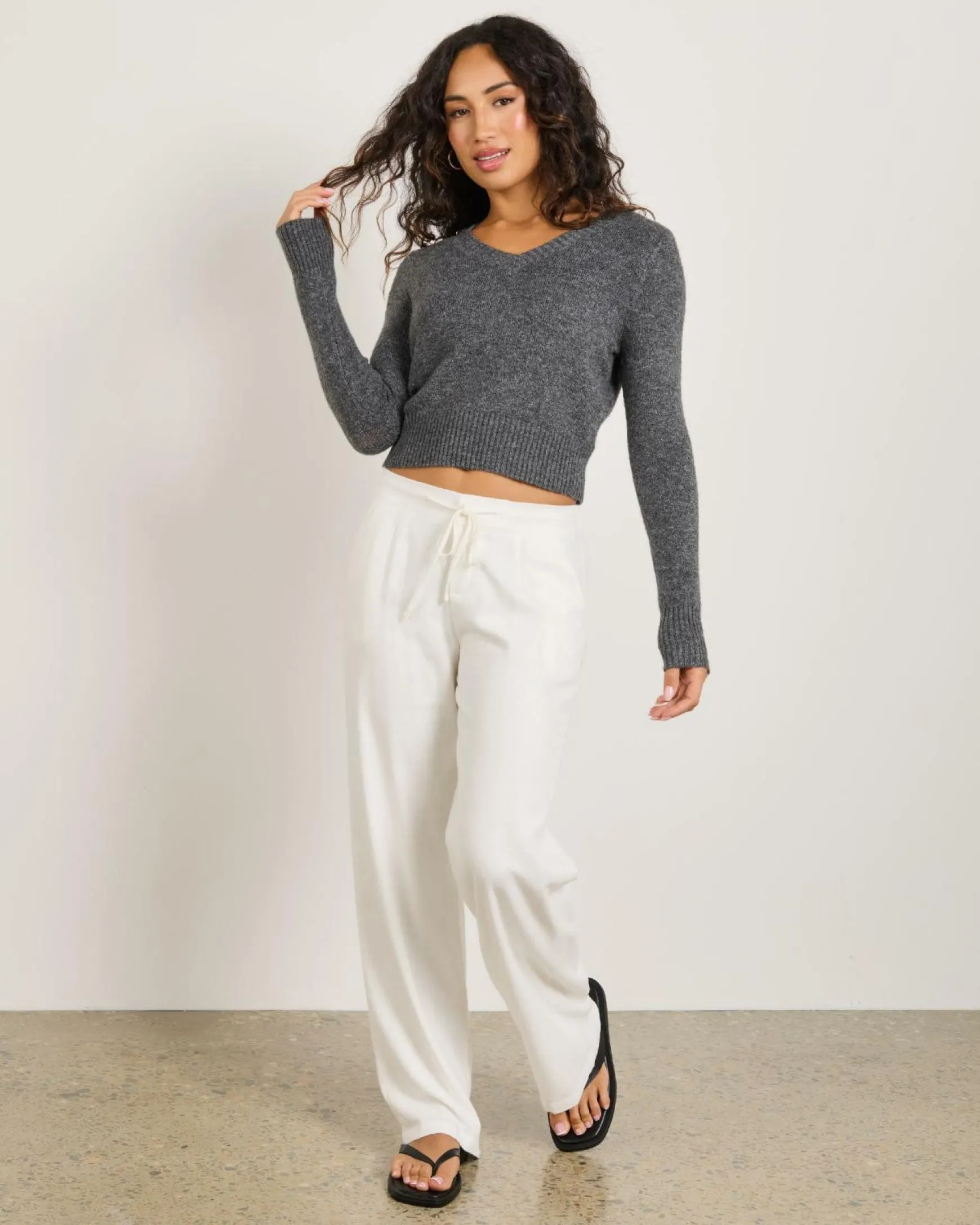 Stay cozy and stylish in the Mooloola PhD V Neck Knit Jumper in Grey. This versatile piece is a must-have for any wardrobe.