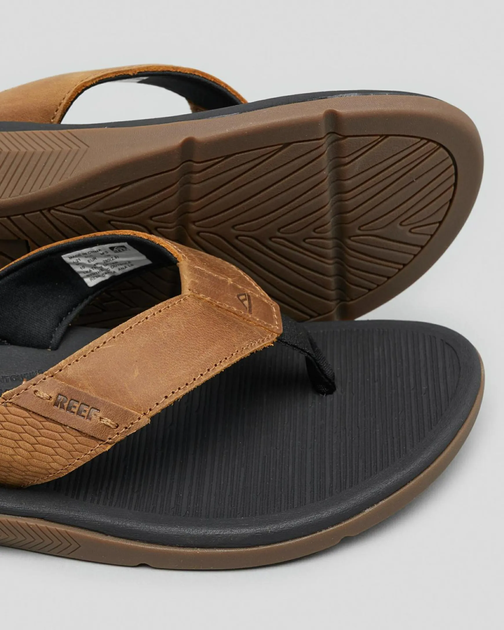 Full grain leather strap with a soft padding.Compression molded EVA footbed.Bamboo inspired footbed texture.