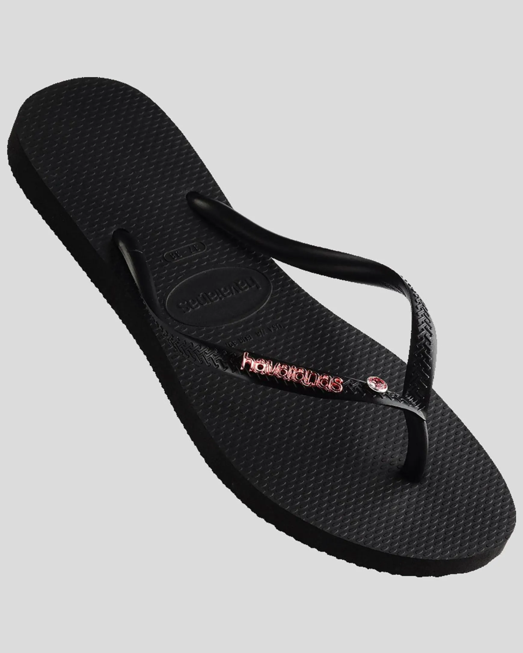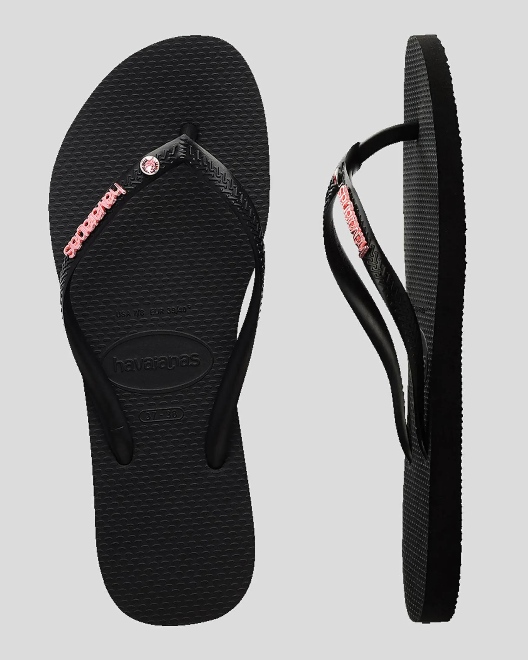 Shine in the spotlight with these sleek black thongs adorned with a pop of pink metal logo crystals. Chic and stylish for summer days.