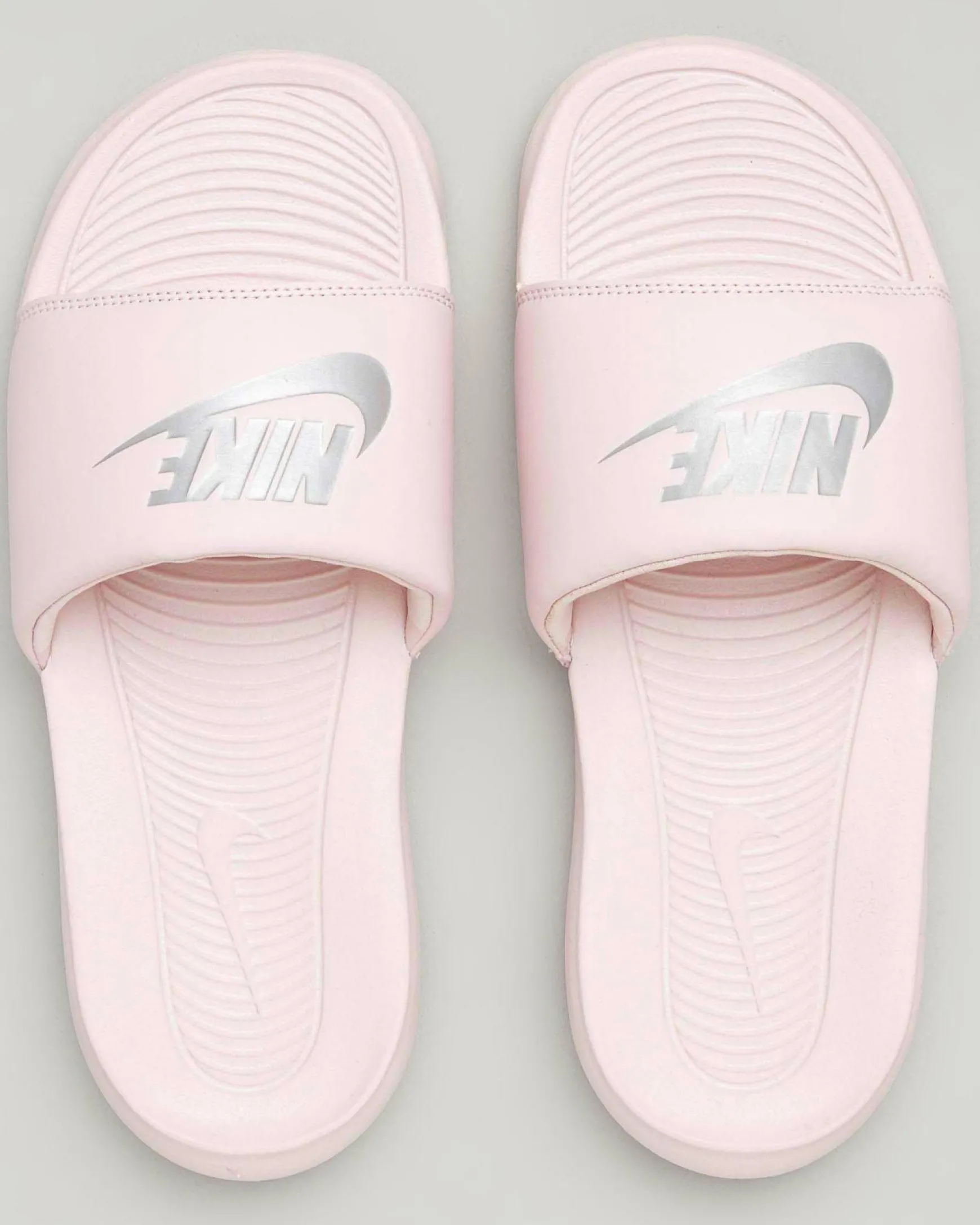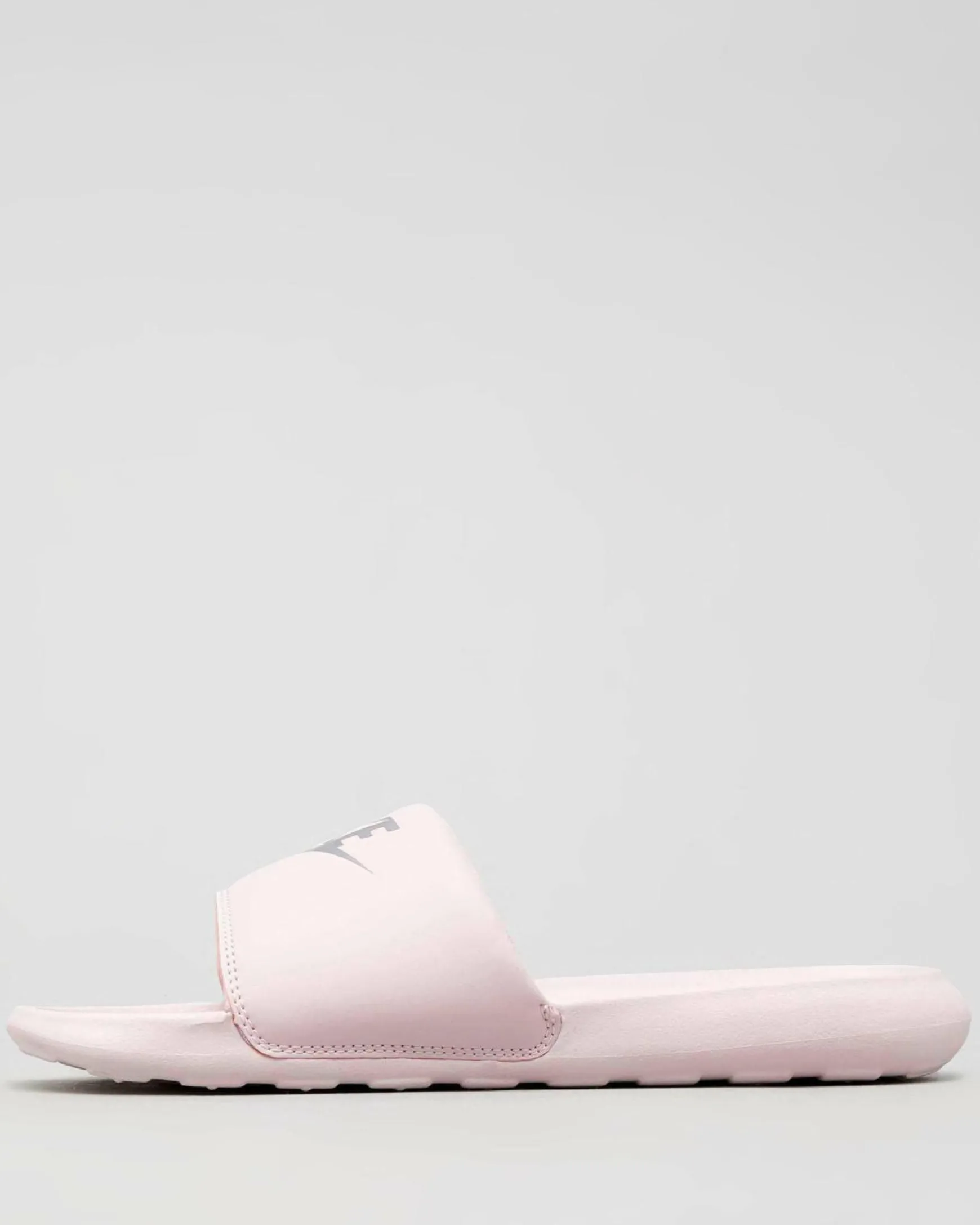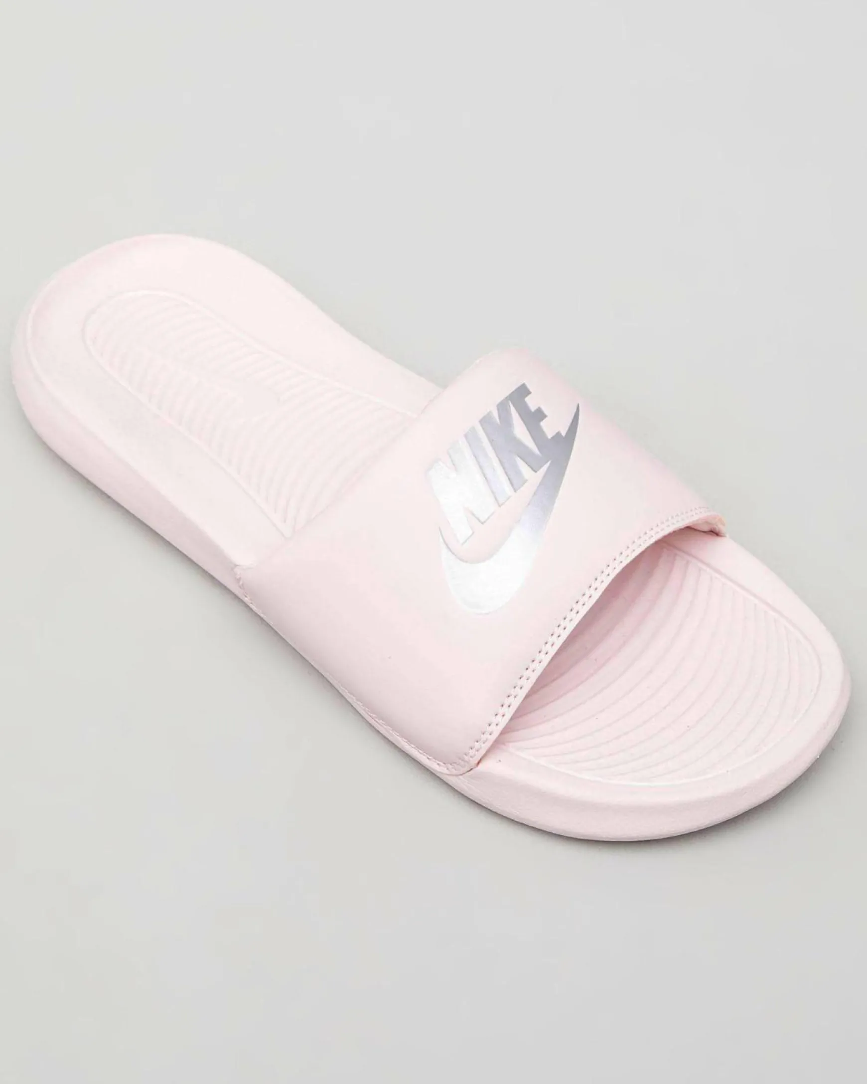The Nike Women’s Victori One Slide Sandals in Barely Rose offer a touch of metallic silver for a chic and stylish look.