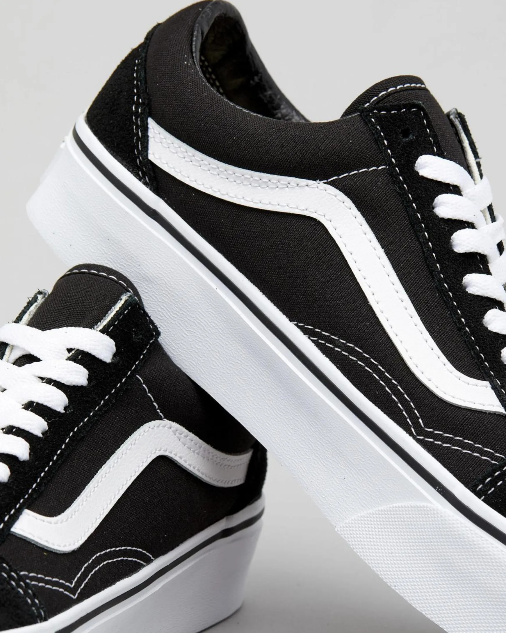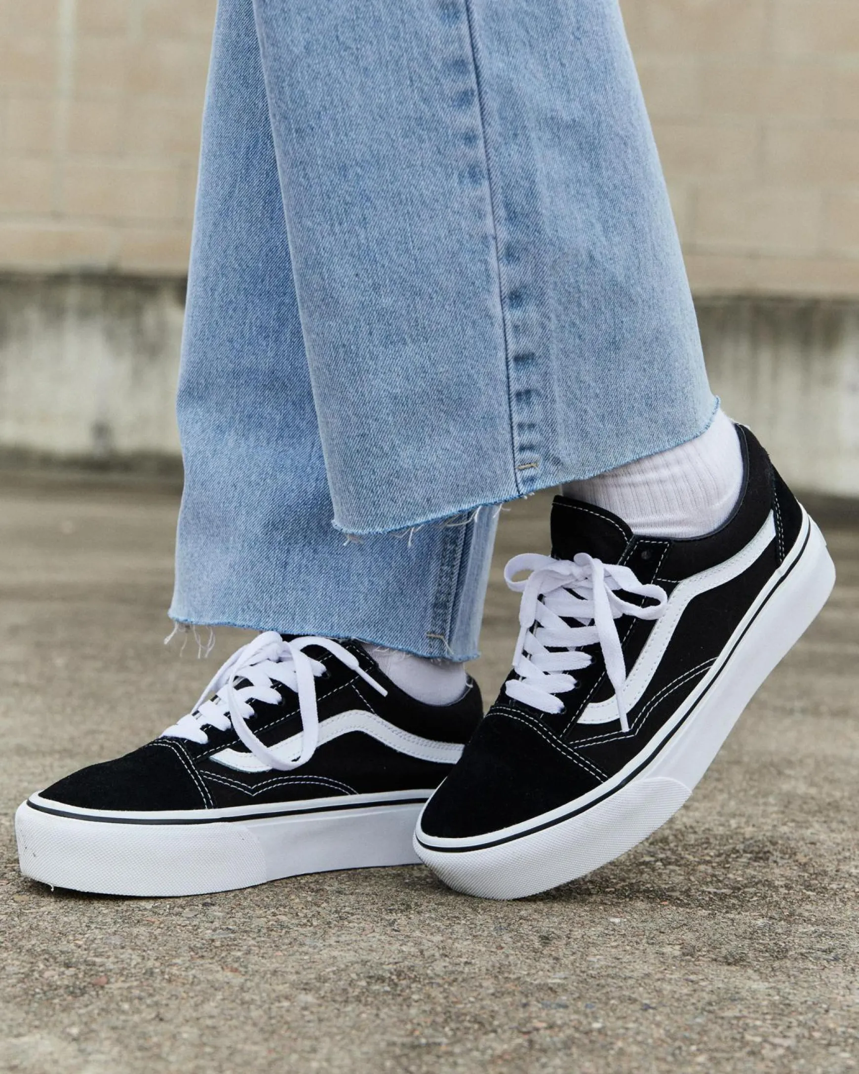 The Vans Womens Old Skool Platform Shoes in classic black and white are a stylish choice for any outfit.